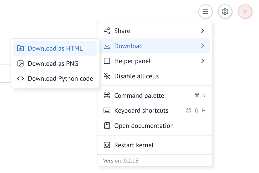 --mode: Choose betweenrun(read-only) oredit(allows editing)--output: Directory to save the HTML and required assets--show-code/--no-show-code: Whether to initially show or hide the code in the notebook--watch/--no-watch: Watch the notebook for changes and automatically export--include-cloudflare: Write configuration files necessary for deploying to Cloudflare